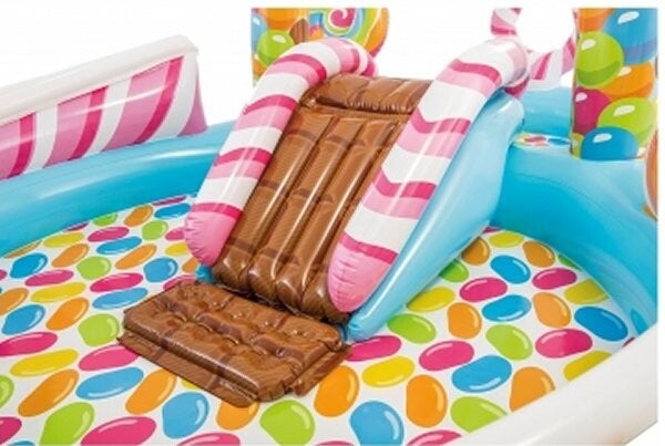 Een prachtig vormgegeven zwembad in snoep-thema! Uren plezier met glijbaan en rolbaan voor de balletjes! Sproeier en waterval kunnen worden aangesloten op de tuinslang. Er worden 6 ballen en 2 lolli pops meegeleverd. Heeft een zachte landingsmat in hetbad voor zachte landingen tijdens het glijden.